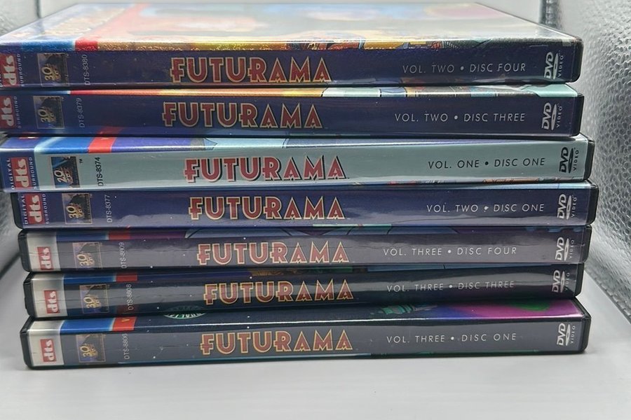 Komplett samling av Futurama DVD-skivor. Inkluderar Volym Ett, Skiva Ett, Volym Två, Skiva Ett, Volym Två, Skiva Tre, Volym Två, Skiva Fyra, Volym Tre, Skiva Tre och Volym Tre, Skiva Fyra.