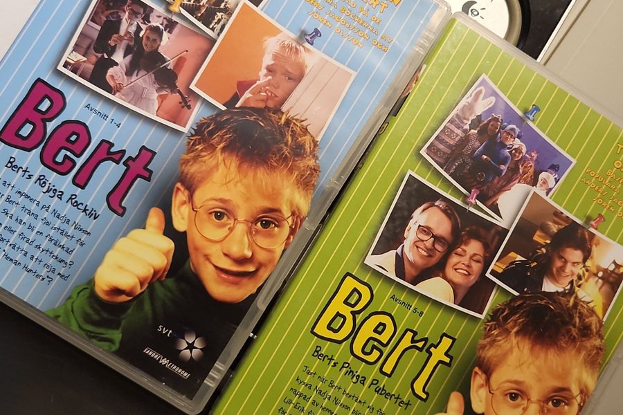 Säljer två DVD-skivor med TV-serien Bert. Den ena skivan innehåller avsnitt 1-4 (Berts Röjiga Rockliv) och den andra innehåller avsnitt 5-8 (Berts Piniga Pubertet).