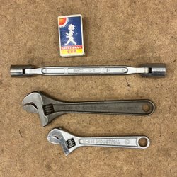 Parti med skiftnycklar i olika storlekar och modeller. Flera av nycklarna är från Bahco.