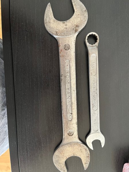 Skiftnycklar i kromvanadium. Den större nyckeln är 3/4 tum och den mindre är 9/16 tum. Den mindre nyckeln är från Bahco, Sverige.
