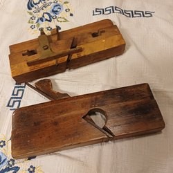 Två hyvlar i trä. En lång modell med handtag och en mindre, böjd modell.
