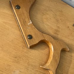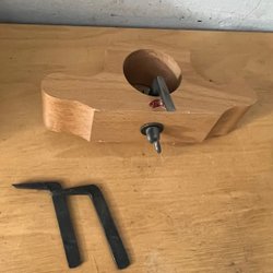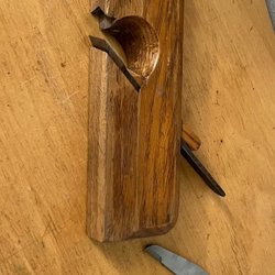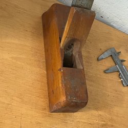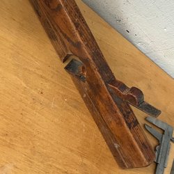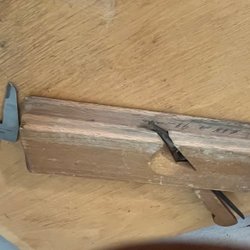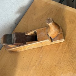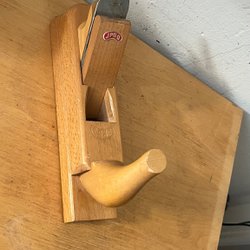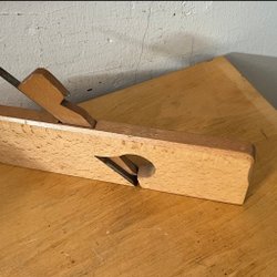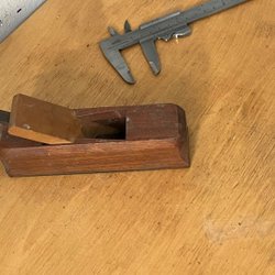 Två hyvlar med röda handtag. Den ena hyveln har en grön bas och den andra har en mörkare bas. En av hyvlarna har en etikett med texten