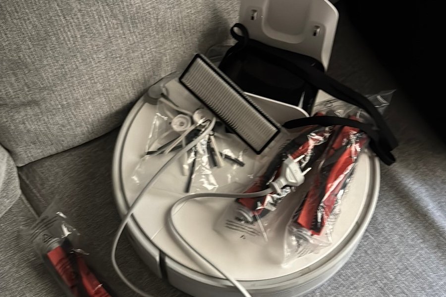 Robotdammsugare med laddstation och flera tillbehör. Inkluderar extra borstar och filter.