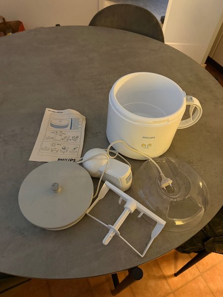 Philips glassmaskin HR2305/HR2304. Inkluderar en vit behållare, en omrörningsarm, ett lock, en motorenhet och en bruksanvisning.