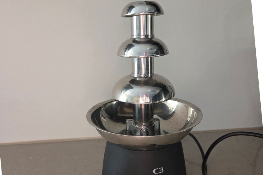 Chokladfontän med tre nivåer. Basen är svart och fontändelarna är i rostfritt stål. Den har en ratt för att välja mellan av, värme och värme/flöde.