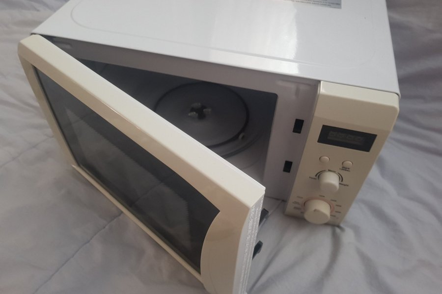 Mikrovågsugn med digital display och lättbegripliga vred för inställningar. Luckan öppnas framåt och insidan har en roterande platta. Märke Logik. Mått: 44cm (b), 33cm (d), 26cm (h).