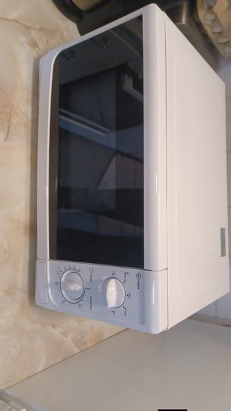 Vit mikrovågsugn med roterande tallrik. Utrustad med vred för timer och effektinställningar. Tydliga markeringar för olika effektnivåer som Low, Med, M-High och High, samt en avfrostningsfunktion. Timerfunktionen sträcker sig upp till 35 minuter.