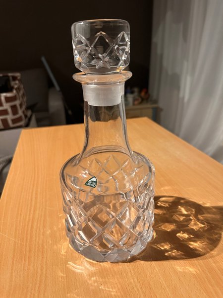 Karaff från Orrefors Sweden. Tillverkad i glas med ett mönster av slipade rutor. Karaffen har en propp. Karaffen designad av Gunnar Syrén 1961. Karaffen rymmer 75 cl och passar för vatten, whisky eller vin. Denna karaff är en tidlös del av svensk glashistoria.