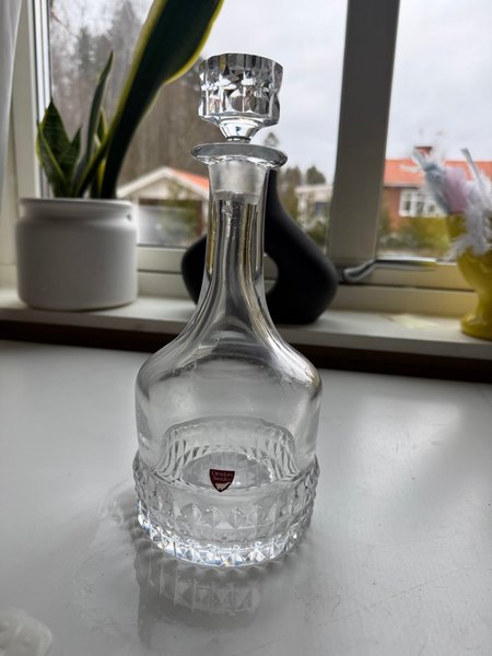Karaff från Orrefors Sverige. Karaffen har en propp och en mönstrad bas.
