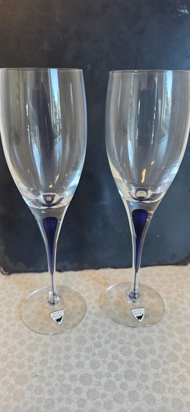 Ett par eleganta champangeglas från Orrefors med en vacker blå detalj i foten. Perfekta för att förhöja din dryckesupplevelse.