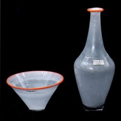 Skål och vas från Boda. Design av Bertil Vallien. Den runda är signerad h=10,7 cm d=14,3. Den ovala vasen h=16,7 cm, b=13,3 cm, b2= 7,0 cm.