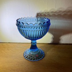 Två IITTALA Marimekko ljuslyktor i glas, en i mörkblått och en i turkosblått. Passar för värmeljus. Ca 6 cm höjd och 6 bredd