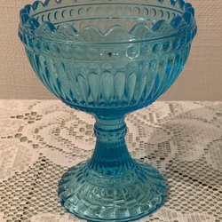 Vacker glasskål på fot i mörkblått glas. Skålen har en räfflad design och en dekorativ kant.