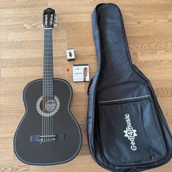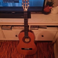 En klassisk gitarr som väntar på att bli spelad. Perfekt för nybörjare eller erfarna musiker.