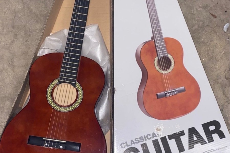 Klassisk gitarr i originalkartong. Extra nylonsträngar, stämma pipa och plektrum ingår. Instruktioner för strängbyte och hur du stämmer gitarren.