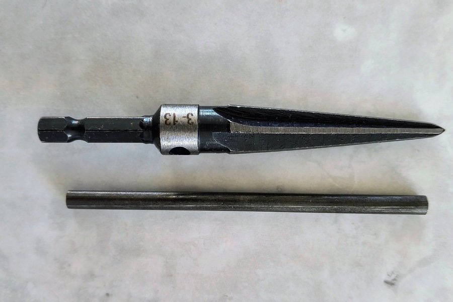 Brotsch med handtag för justering stallpinnshål på akustisk gitarr i specialdimensionen 3/13.