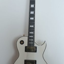 Akustisk gitarr i blått och svart. Gitarren har sex strängar och stämskruvar i metall och plast. Halsen är slät och greppbrädan har tydliga bandmarkeringar.