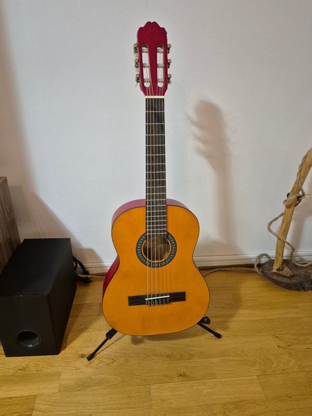 Klassisk gitarr i mindre storlek 1/2 vilket passar för barn mellan ca 5-10 år . Köptes för barnen och spelade lite så den fortfarande i fin skick ,dessutom får du extra 6 st nya strängar.