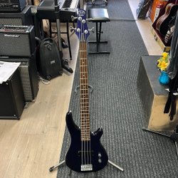 Maison elbas i svart utförande. Instrumentet har fyra strängar och en svart kropp. Halsen är i ljust trä med mörka band. Stämskruvarna är i metall. En svart axelrem är monterad på elbasen.