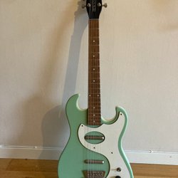 Elgitarr typ Stratocaster,i färgerna röd, orange och svart. Slitage märken finns , se foto. Den har en lönnhals och en mörkare greppbräda. Plektrumskyddet har ett marmorerat mönster i brunt och gult. Mikrofonerna och övriga metalldelar är i guld. Märke Wilkinson. Mycket bra hals, lättspelad
