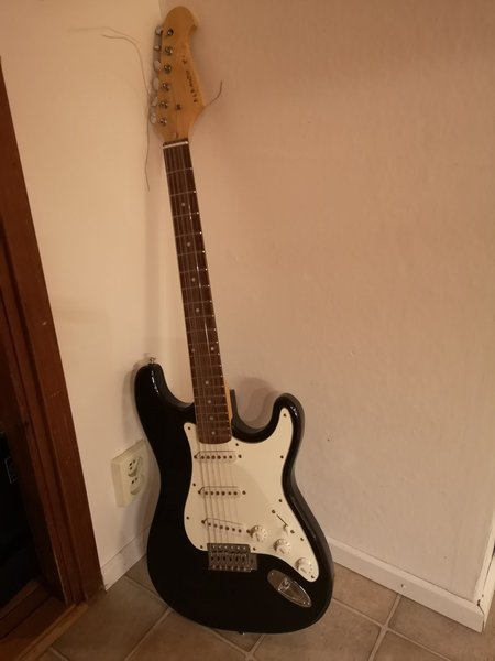 Elgitarr av märket B&B Audio, modell X1. Svart kropp med vit plektrumskydd. Perfekt för både nybörjare och erfarna gitarrister.