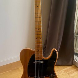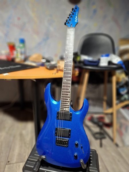 Elgitarr i blått. Gitarren har svarta humbucker-pickuper och en matchande blå headstock. Den har sex strängar och svarta stämskruvar.