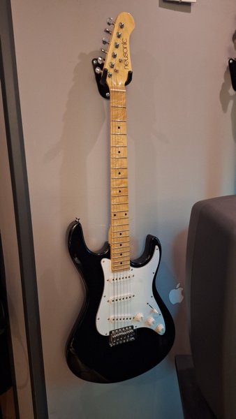 Elgitarr från Neusonic. Gitarren har en svart kropp med vit plektrumskydd och lönnhals. Den är utrustad med tre single-coil pickuper och standardkontroller för volym och ton.
