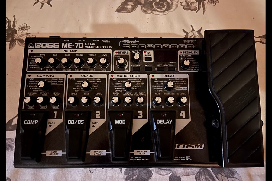 Boss ME-70 är en pedal med gitarr multieffekter. Den har COMP/FX, OD/DS, Modulation, Delay och Pedal FX sektioner. Den har även inbyggd tuner/bypass funktion.