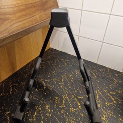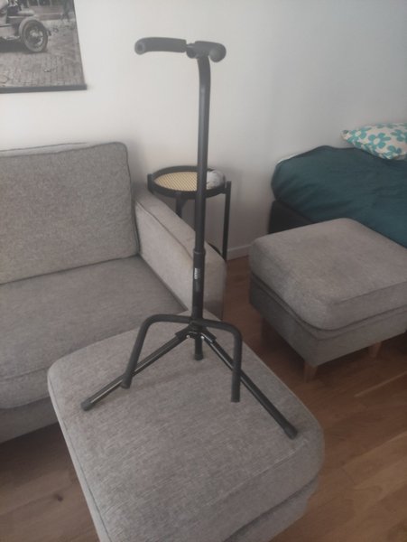 Svart gitarrstativ med tre ben för stabilitet. Stativet är justerbart i höjd.