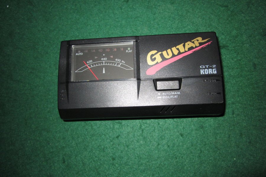 Korg GT-2 gitarrstämmare med automatisk och manuell inställning. Stödjer stämning för 6E, 5A, 4D, 3G, 2B och 1E strängar. Frekvensområde från 430 Hz till 450 Hz.