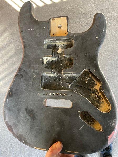 Naken kropp, omålad (utöver lite rosa färg bak på kroppen), innehåller inga delar förutom förankringsplatta bak för fjädrarna till vibraton, samt jordningskabel. Okänt vilken träsort det kan vara men kanske al eller basswood.