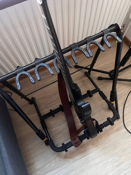Säljer ett gitarrställ. Stället är designat för att rymma upp till 6 gitarrer. Det är en praktisk lösning för förvaring av flera instrument.