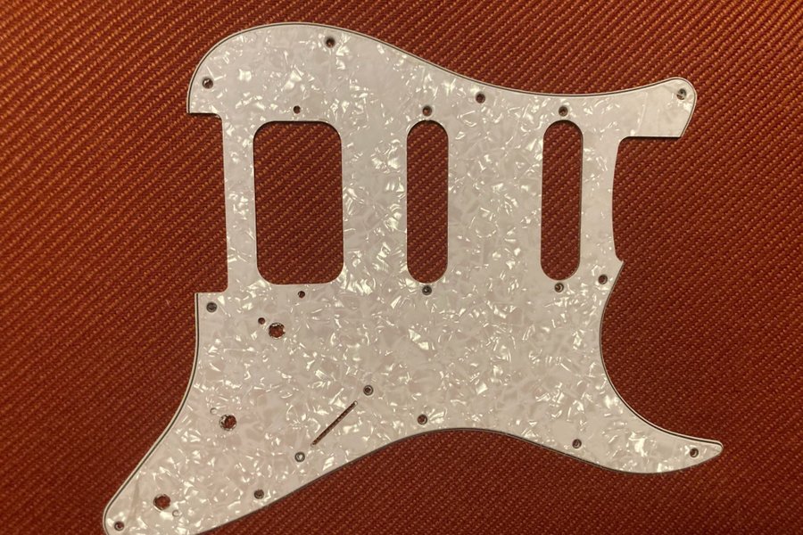 Plektrumskydd i pärlemor för en humbucker i stalläge. Skyddsplasten fortfarande kvar.