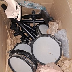 Elektroniskt trumset med trummor, cymbaler, pedaler och kontrollpanel. Perfekt för den som vill öva eller spela in musik hemma. Se bilder för detaljer om anslutningar och panelkontroller. Setet är nerpackat i kartong, klart för avhämtning. Allt finns med för ihopsättning.