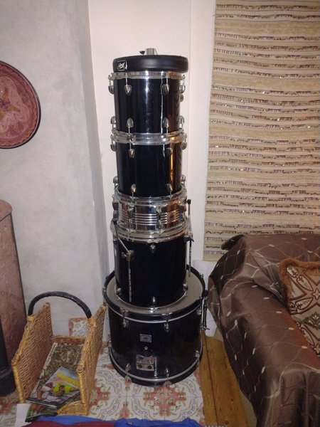 Svart trumset från Peavey. Setet består av flera trummor i olika storlekar, inklusive en bastrumma och flera pukor. Trummorna har kromade detaljer och Peavey-logotypen är synlig på flera delar inklusive pedal till bastrumman, Hayat, symbal, pall med stativ.