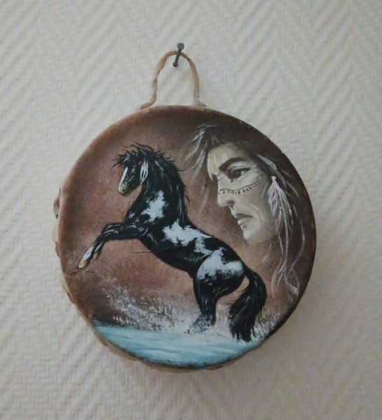 liten trumma handgjord med motiv av häst och indian. 17 cm diameter och 6 cm tjock.