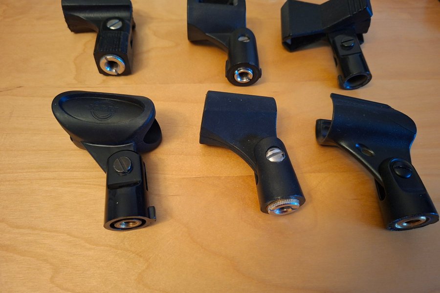 Sex stycken mikrofonhållare. Passar till de flesta mikrofoner. Tillverkade av plast. Hållaren uppe till höger saknar förskruvning.