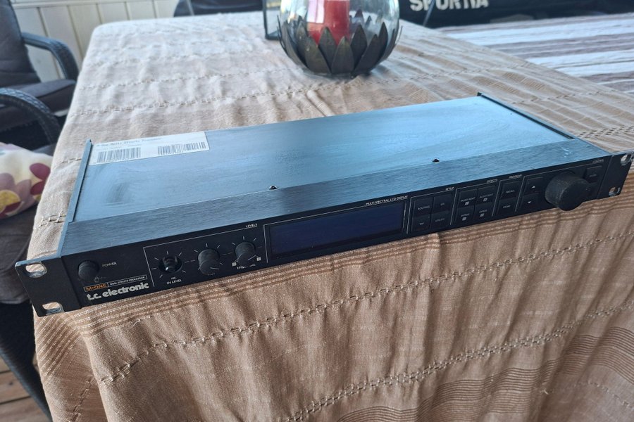 TC Electronic M-One Dual Effects Processor är en mångsidig enhet för ljudeffekter. Den har en MULTI SPECTRAL LCD DISPLAY och kontroller för nivåer, routing, I/O, algoritmredigering, bypass, recall, store, tap och utility. Enheten är designad för att hantera olika ljudeffekter och program.