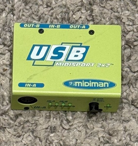 Midiman Midisport 2x2 USB MIDI-interface. Anslutningar: OUT-B, IN-B, OUT-A, IN-A.