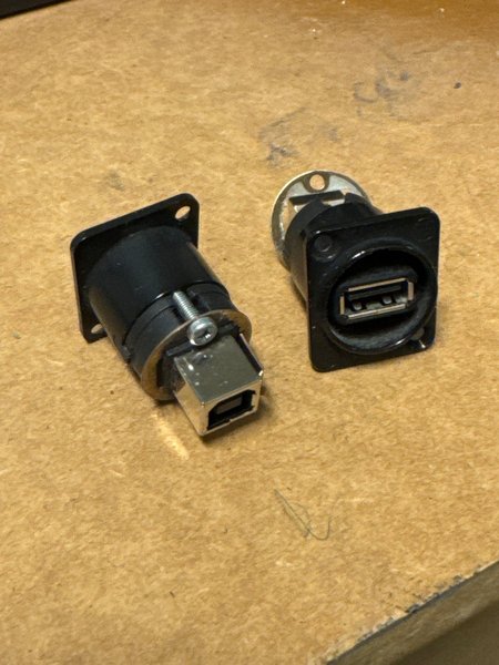 2st USB-kontakter designade för panelmontering. USB A på framsidan och USB B på baksidan