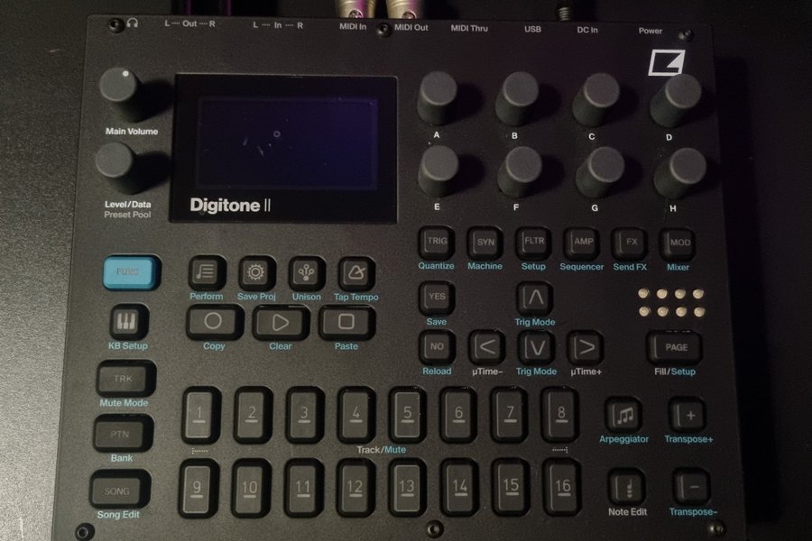 Elektron Digitone II är en digital FM-synthesizer med åtta röster. Den har en inbyggd sequencer, flera effekter och omfattande anslutningsmöjligheter inklusive MIDI In, Out, Thru och USB. Enheten har kontroller för volym, data/preset-pool, samt dedikerade rattar för parametrar A-H. Knappar för funktioner som Perform, Save Proj, Unison, Tap Tempo, Copy, Clear, Paste, KB Setup, TRK, Mute Mode, PTN, Bank, SONG, Song Edit, Trig, Syn, Fltr, Amp, FX, Mod, Quantize, Machine, Setup, Sequencer, Send FX, Mixer, Yes, Save, No, Reload, µTime-, Trig Mode, µTime+, Page, Fill/Setup, Arpeggiator, Transpose+, Note Edit och Transpose- finns tillgängliga. Den har även 16 numrerade knappar för spår/mute-kontroll.