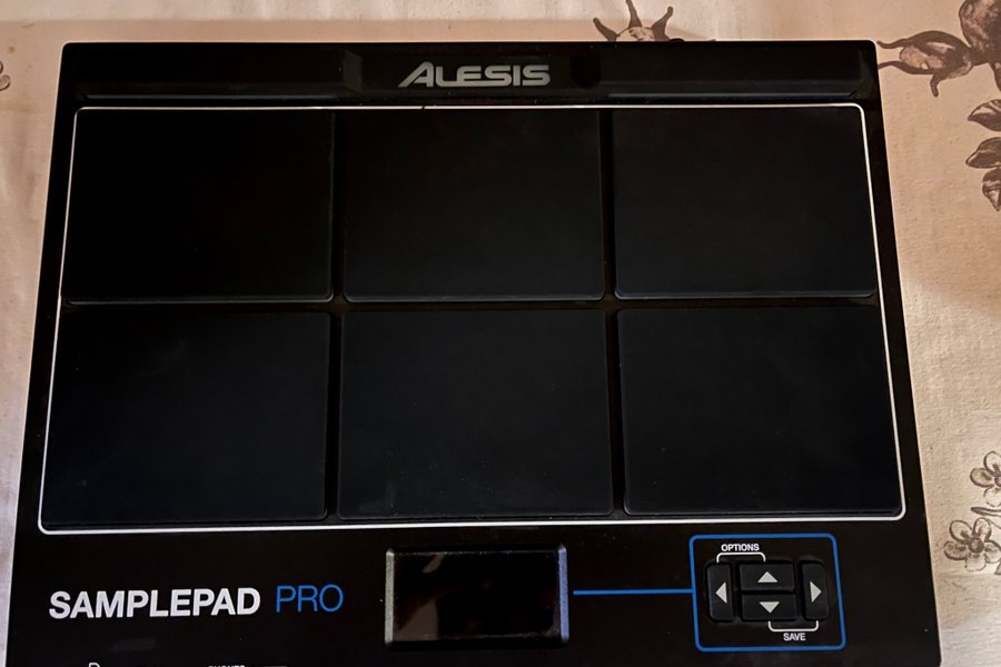 Alesis SamplePad Pro är en samplingpad med åtta anslagskänsliga pads. Den har anslutningar för SD-kort, main output och hörlurar. Enheten inkluderar en display och knappar för navigering och inställningar.