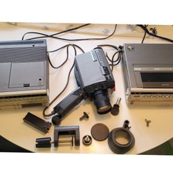 En videokamera med tillbehör.Verkar fungera men ej testat mer än i strömmen Det finns lite smuts när man ser igenom och luckan öppnar och stänger som det ska Det är vad jag har testat Annars i fin skick