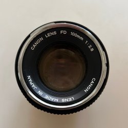 Kameraobjektiv med "CANON LENS FL 135mm 1:3.5 No.100681" tryckt på linsen. Objektivet har även texten "CANON CAMERA Co., Inc. LENS MADE IN JAPAN" på linsen. Avståndsmarkeringar i fot och meter finns på objektivets kropp. Ett linsskydd med "Canon Japan" är inkluderat.