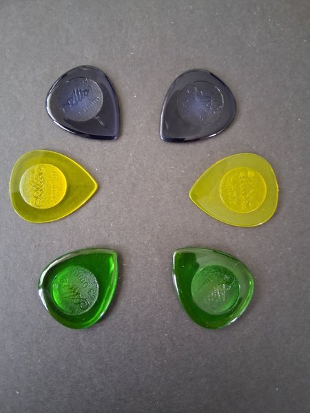 6 st plektrum till bas eller kanske något annat instrument. Tjocklekar 1 mm, 2 mm och 3 mm. Storlek 3x2,5 cm. Färgerna kan skilja sig från bilden, men du får 2 st av varje tjocklek och färg.