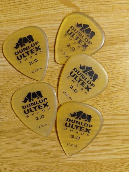 Säljer ett set med 5 stycken Dunlop Ultex Sharp 2.0 plektrum. Perfekt för gitarristen som söker precision och kontroll.