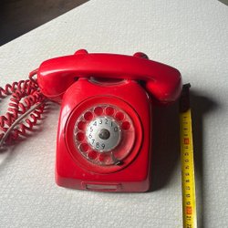 En klassisk röd telefon med roterande nummerskiva. Perfekt för den som älskar retrodesign.
