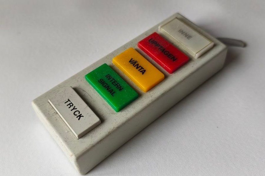 Telefonknappsats med en knapp. Lamporna är i färgerna vit, röd, gul och grön. Text på knapparna inkluderar "INNE", "UPPTAGEN", "VÄNTA", "INTERN SIGNAL" och "TRYCK".
