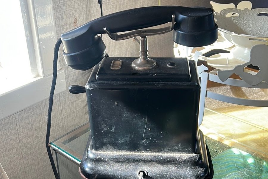 Telefon i svart färg. Modellen är en äldre variant med en lur som vilar på en metallhållare ovanpå telefonens bas. En vev finns på sidan av telefonen. Sladdar är anslutna till enheten.