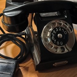 Telefonapparat i svart färg. Telefonen har en vev på sidan och en lur som vilar på en metallhållare ovanpå enheten. En tygklädd sladd ansluter luren till basenheten. En annan tygklädd sladd med en rund anslutningsplatta med synliga ledningar kommer ut från basenhetens baksida.